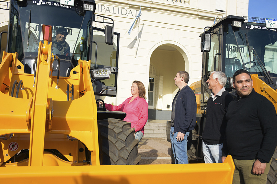 Tres palas cargadoras y una retropala fueron presentadas frente al Palacio Municipal, junto a camiones que fueron reacondicionados en el taller del Corralón. Entre 2024 y 2025 se invirtieron más de 1.600 millones en maquinaria.