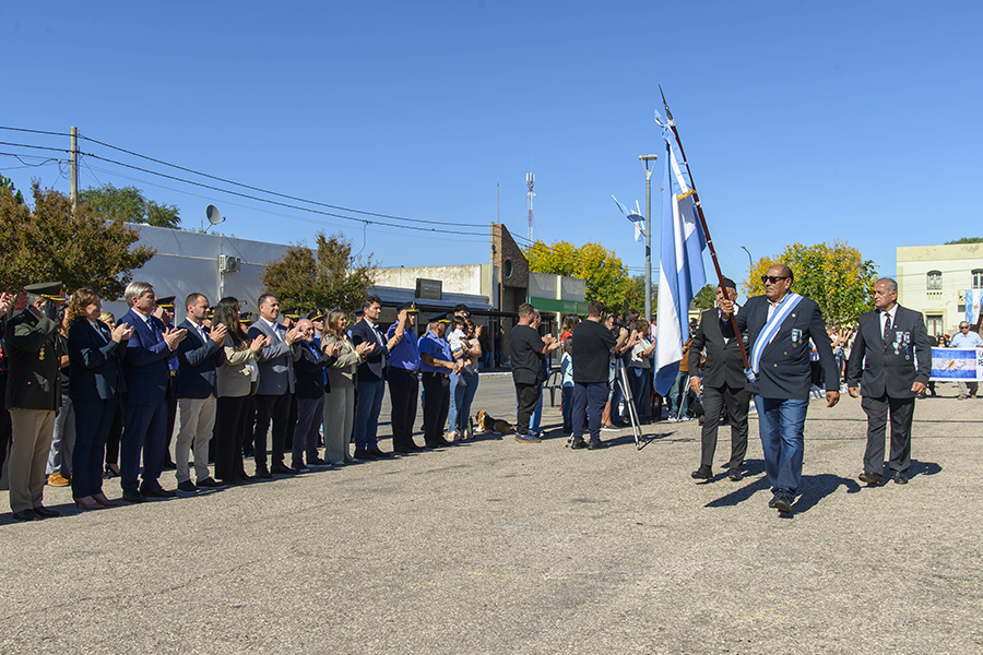 Bajo un cielo que acompañó el recogimiento de los presentes, la plaza central de la localidad albergó a una nutrida comitiva que incluyó al intendente anfitrión, Iván Furh, legisladores nacionales y provinciales, autoridades del gabinete pampeano y representantes de fuerzas de seguridad. Sin embargo, el centro de todas las miradas y el mayor respeto fue para los veteranos de guerra presentes: Eugenio Pedruelo, Mario Roda, Carlos Calmels, Rolando Contreras, Raúl Cabanillas, Luis Pereyra, Daniel Palacios y Carlos Schloser, junto a una delegación especial de veteranos llegados desde Punta Alta.