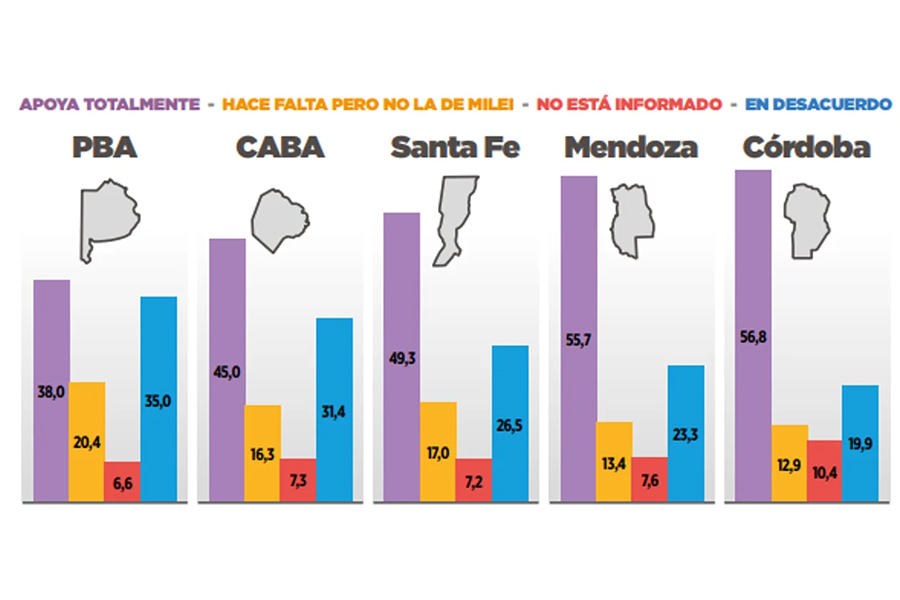 Contrariamente, entre quienes quieren una reforma diferente a la que plantea Milei, que es el 18,7%, “predomina la crítica” hacia el Presidente y sostienen que atraviesan un “empeoramiento económico”; en cuanto a el accionar de los mandatarios provinciales, sostienen que deben asumir un rol “en defensa” de sus distritos y hacerlo “en clave federal”.