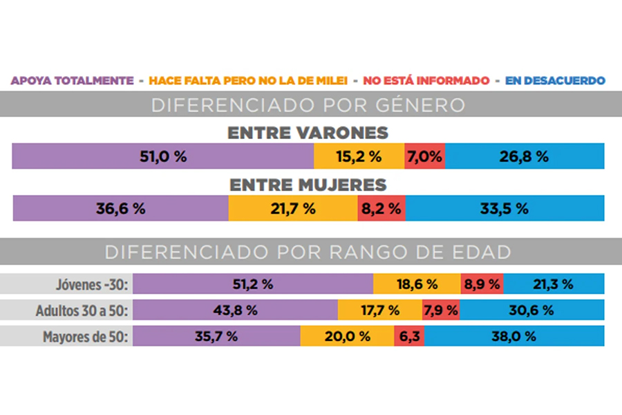 “Un 43,1 % adhiere plenamente a la propuesta de Milei, mientras que un 18,7 % reclama una reforma distinta. En el otro extremo, cerca del 30 %, la rechaza de plano. Como en otros temas, estas posiciones se reconfiguran según edad y género: entre los jóvenes de entre 18 a 30 años, el 63,2% de los varones apoya la reforma de Milei frente al 40,6% de las mujeres, brecha que se amplía aún más al comparar varones jóvenes con mujeres mayores de 50 años”, asegura el informe.