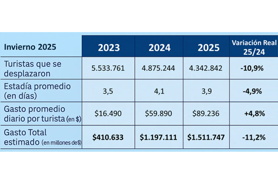 El movimiento en el receso invernal por las ciudades que integran el circuito turístico nacional fue un 10,9% menor que en 2024 y el impacto económico fue un 11,2% menor a 2024, medido a precios constantes, al totalizar $1,5 billones.